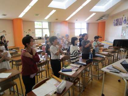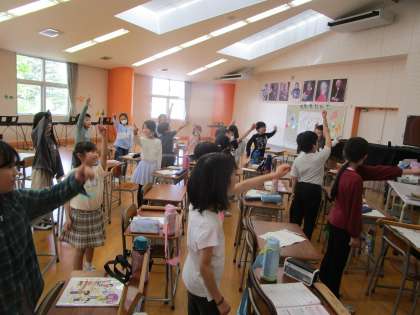 授業のはじめに音楽に合わせてダンスをしています。体を動かすことで楽しく学習に励めます。