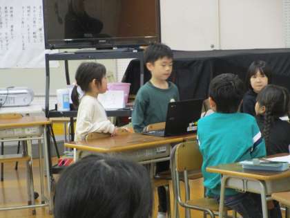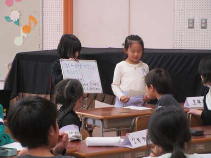 学校スローガンについて各学年の代表が集まり、話し合いました。1年生もスローガンをもとに一生懸命に取り組みたいことを伝えました。とても立派でした。