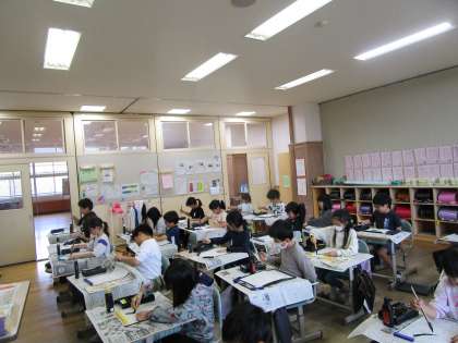 4年生 書写 公開日 2024/05/08 更新日 2024/05/08 4年生 毛筆の点画の種類の学習をしました。道具の置き方、筆の持ち方、始筆・終筆の復習をし、横画・縦画・右払い等の基本的な筆使いを練習しました。「上手く書けた」「あ、太くなった」など言いながら楽しみながら練習できました。