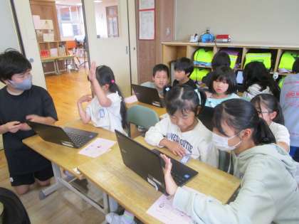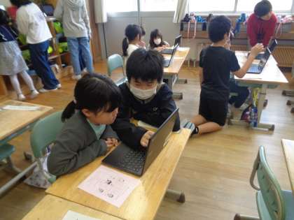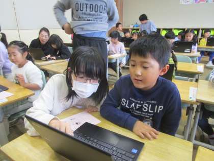 6年生 1年生さんのパソコン先生 公開日 2024/05/08 更新日 2024/05/08 6年生 初めてパソコンを使う1年生さんにログインの仕方やカメラの使い方などをパソコン先生として優しく教えていました。パスワードの入力を手伝ったり、一人で電源を付けたり消したりできるか見守ったりするなど、頼もしい姿がたくさん見られました。