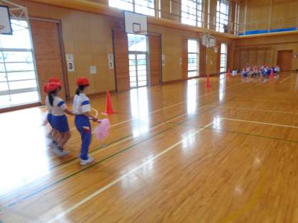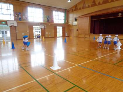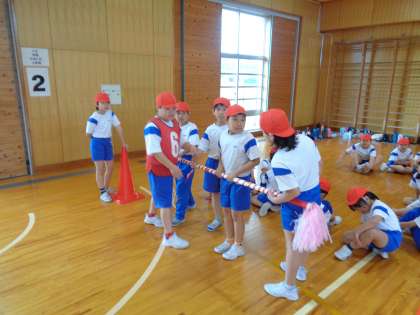 運動会の団体競技「台風の目」の練習をしました。どのように棒を持てばよいか、どのように回ったらよいか等、色団ごとに作戦を立てていました。