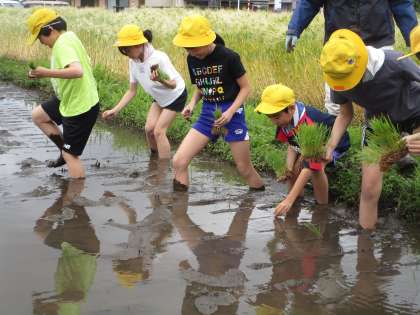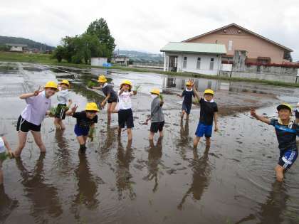 今日は大杉営農組合や民生児童委員の皆様にお世話になり、田植え体験活動を行いました。昨日から雨が降り続き、今朝も天候が悪かったですが、何とか雨が止み、実施することができました。子供たちは、教えてもらったやり方で丁寧に苗を植えました。中にはぬかるみに足を取られて転倒し、泥だらけになってしまった子供も・・・。しかし、それも含めてよい経験になったようです。田植えの大変さに気付き、農家の方に感謝して食事をしたいという思いが強くなった子供たちでした。