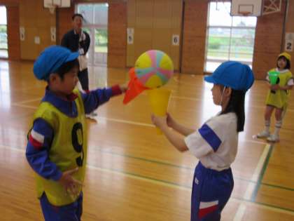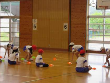 素早く体を動かせるように、ミニコーンをタッチしました。また、アイスクリームコーンリレーを行い、バランスを取りながら速く走れるように試していました。