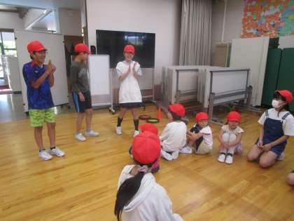 朝の支度や給食準備のサポートで関わってきた1年生と、これまでよりもっと仲よくなるために、団ごとに分かれてできることを考えて活動しました。1年生が笑顔になったり頼ってくれたりすると、6年生も自然と笑顔になりました。
