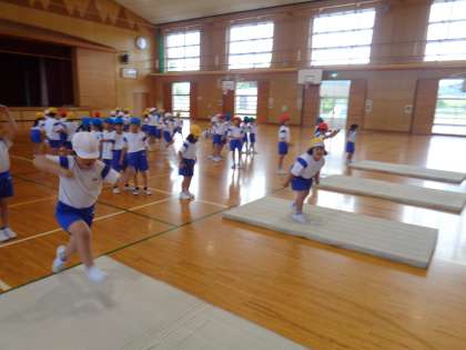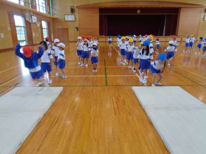 立ち幅跳びの練習では遠くに跳ぶために勢いをつける練習をしました。