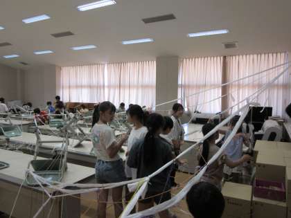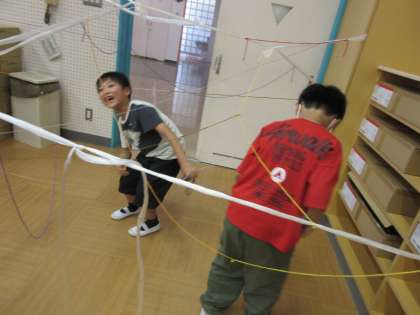 完成した「ひもひもワールド」に、杉の子を招待しました。笑顔と歓声があふれていました。