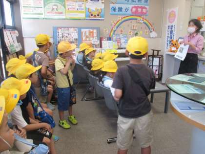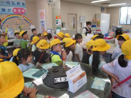 杉原郵便局では、郵便局の仕事について教えていただきました。はがきに63円切手を貼れば、北海道や沖縄県にも届く仕組みや、昔のポストは黒色だったことを知り、びっくりしていました。