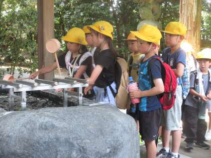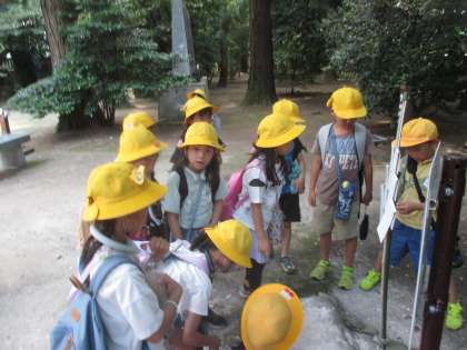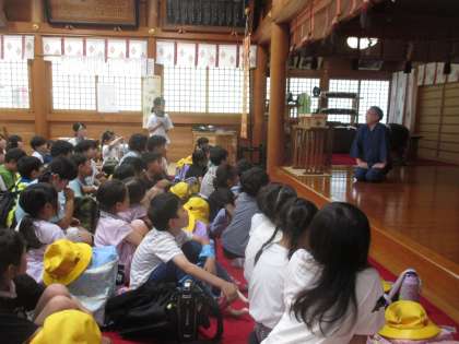 杉原神社では、杉原神社の歴史や神様などについて詳しく教えていただきました。子供たちも、意欲的に質問していて素晴らしかったです。「2000年前から、杉原神社があるなんてすごいなあ」「ご神木が大きくてびっくりしたょ」「今度は、おうちの人と一緒に来たいなあ」と言っていました。