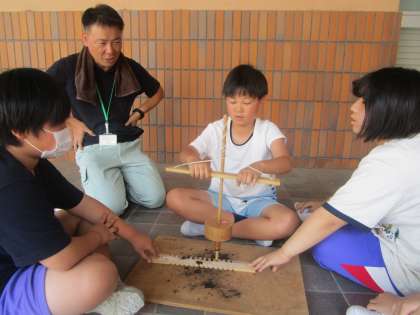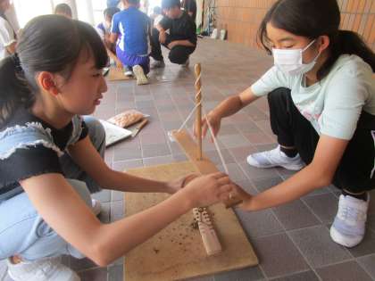6年生 火起こし体験1 公開日 2024/06/21 更新日 2024/06/21 6年生 歴史学習の一つとして火起こし体験に挑戦しました。 まいきり式のやり方に悪戦苦闘しながらも、班の仲間と協力しながら火をおこそうと一生懸命に取り組んでいました。