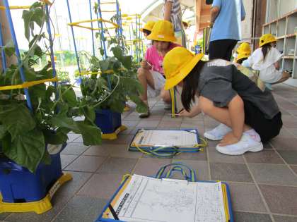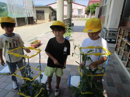 1年生 つるが のびたよ 公開日 2024/06/21 更新日 2024/06/21 1年生 あさがおの観察をしました。「自分の手よりも大きな葉っぱがある」「つるがねじれていておもしろい」などの気付きがあったようです。小さなつぼみもいくつかあり、「もうすぐ咲くかな」とわくわくしている子供たち。きれいな花が咲いてほしいですね。