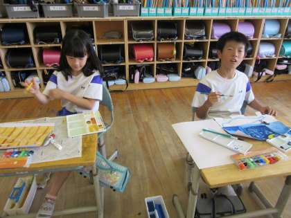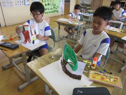3年竹組 図画工作科 公開日 2024/06/24 更新日 2024/06/24 3年生 「立ち上がった絵の世界」の制作に取り組んでいます。どんな世界が見えるようにしようか、考えながら取り組んでいます。