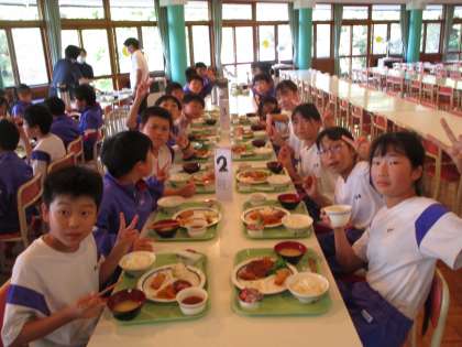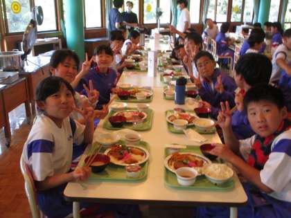 食堂での夕食の様子です。みんなで残さず食べました。