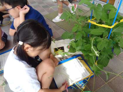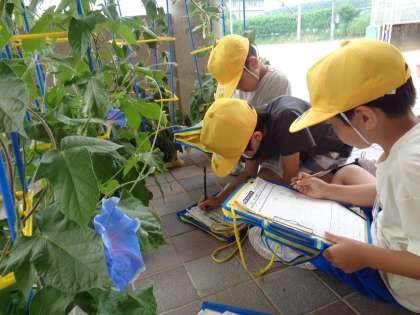 花や葉、つぼみの様子をよく見て観察カードに記録しています。