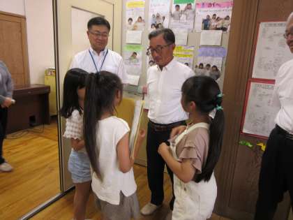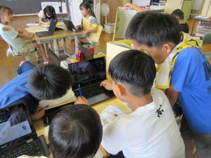 3年生 総合 公開日 2024/07/03 更新日 2024/07/03 3年生 自分の選んだテーマに沿って、調べ学習を進めています。先日は学校運営協議会委員の方々が来校された際にインタビューをしたり、今日は実物の化石を持ってきて話し合ったりする姿がみられました。