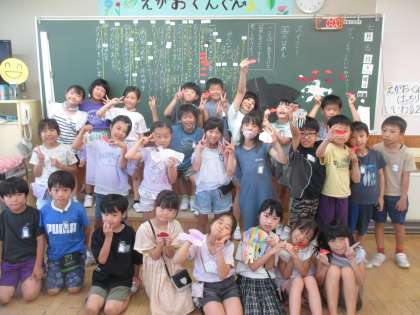 今日は、「スイミー」の最後の場面について話し合いました。子供たちは「スイミー」が大好きで、休憩時間に自主的にスイミーの世界を画用紙等でつくっています。今日は、子供たちがつくったものを掲示し、話し合いました。全員が自分の意見を発表でき、スイミーの思いに迫る深い話し合いができました。話し合う力もぐんぐん伸びています。