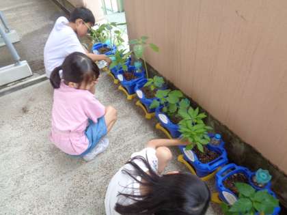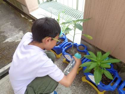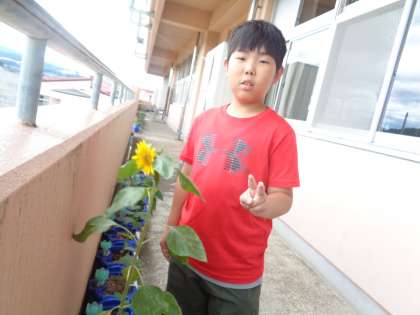 毎朝、ヒマワリやホウセンカなどの植物に水やりをしています。今朝、ヒマワリの花が咲いていました。