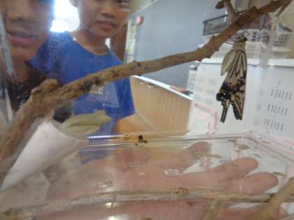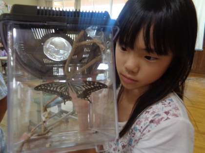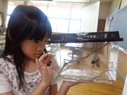 教室で飼っていたアゲハチョウのサナギが羽化していました。その様子をじっくりと観察していました。