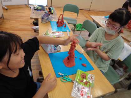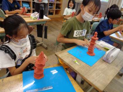 4年生 図工 公開日 2024/07/09 更新日 2024/07/09 4年生 図工では、「立ち上がれ!粘土」の学習をしました。15cm以上のタワーを作るために、土台を工夫したり、バランスを考えたりと試行錯誤しながら取り組みました。