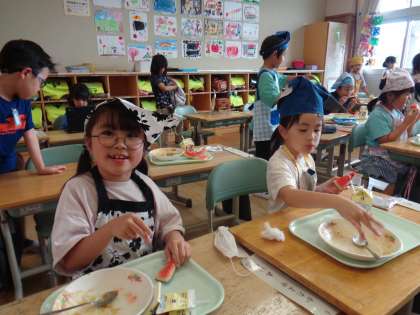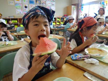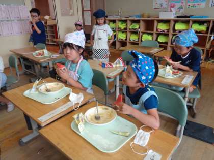 今日の給食のメニューは夏野菜カレーとスイカでした。
