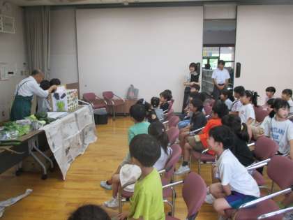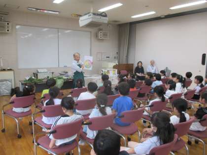 2年生 野菜体験学習 公開日 2024/07/11 更新日 2024/07/11 2年生 本日、2年生は、青果物商業協同組合の皆様に来ていただき、「旬の野菜や果物」に関する実感・体験学習会をしました。野菜や果物に関するお話や紙芝居に子供たちは興味津々な様子でした。最後には、野菜や果物のクイズで、大変盛り上がっていました。子供たちから「好き嫌いなく給食を残さず食べようと思った」「クイズが楽しかった」等の感想が出されました。