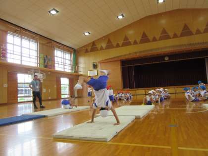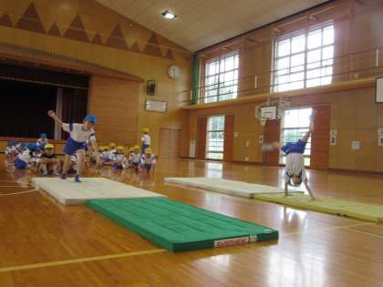 3年生 体育科 公開日 2024/07/19 更新日 2024/07/19 3年生 これまで練習してきた技の発表会をしました。友達が終わりのポーズを決めたときには、温かい拍手を互いにおくり合っていました。