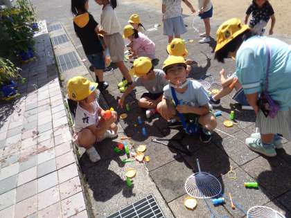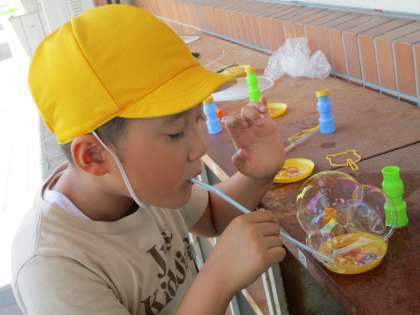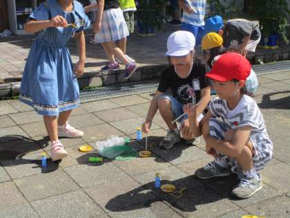 大きなシャボン玉を友だちと協力して作ろうとしたり、飛んでいくシャボン玉を追いかけたりして楽しんでいました。