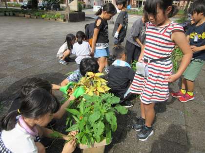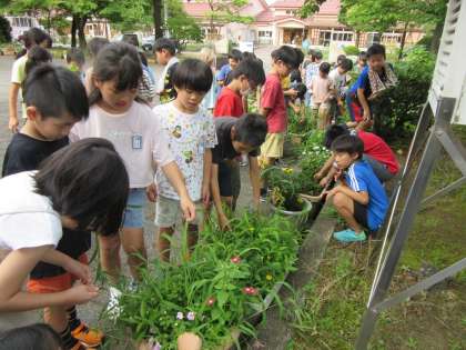春に植えた花の世話をしました。思った以上の雑草の量に驚いていましたが、みんなで力を合わせて手入れをしていました。