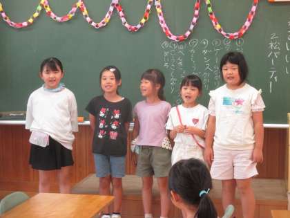 2年生 松組 えがおいっぱい2松パーティー その2 公開日 2024/07/23 更新日 2024/07/23 2年生 続いて、3択クイズと、ゲーム係の『3時のおやつ 夏バージョンと学級目標バージョン』で盛り上がりました。