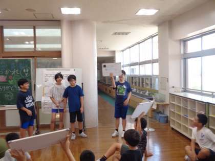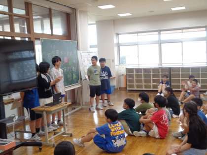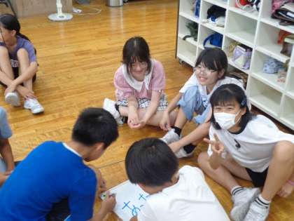 6年生 1学期おつかれ&ありがとう集会 1 公開日 2024/07/23 更新日 2024/07/23 6年生 1学期お疲れ&ありがとう集会を行いました。 第一部は、なぞなぞと連想ゲームをしました。 チームの仲間と相談しながら、楽しく問題に答えたり、お題に合った答えを考えたりしていました。
