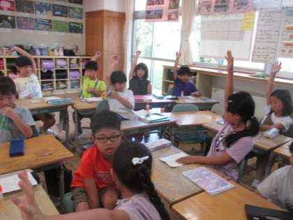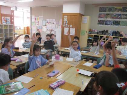 国語の時間に、夏休みの思い出を伝え合いました。うなずきながら聞いたり、質問をしたりする子供が多くおり、聴き方がレベルアップしていて嬉しくなりました。今日は、数人しか話す時間がなかったので、明日続きをする予定です。