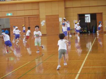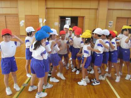 2年 学習のようす 公開日 2024/08/28 更新日 2024/08/28 2年生 2学期、最初の体育では、体をほぐす運動として、手つなぎ鬼ごっこやじゃんけん列車を行いました。子供たちは、友達と関わりながら楽しそうに体を動かして学習に取り組んでいました。