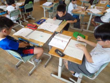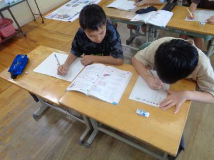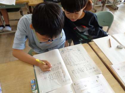 あまりのあるわり算の練習問題を、好きな友達と自分のペースで進めています。友達同士で分からないことを教え合っていました。