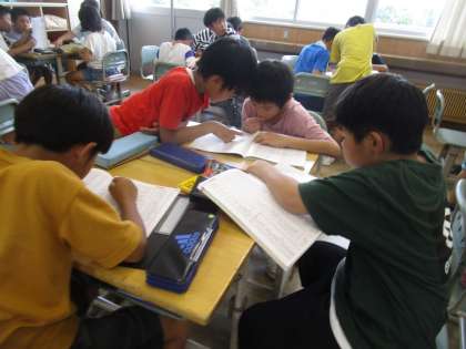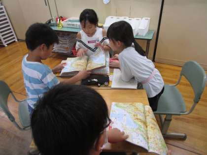 合同社会科を行いました。授業の初めに行った場所クイズでは、友達と顔を寄せ合って地図から地名を探していました。