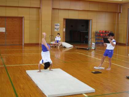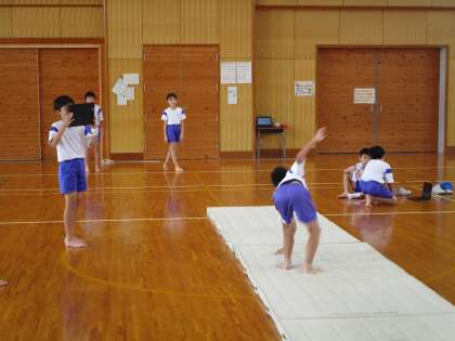 今日から体育ではマット運動を始めました。自分に合った技を選び、動画を見たり自分の姿を撮影したりしながら練習しています。今回は3つの技を繋いで連続技の発表会をします。金メダルを目指して張り切って練習に取り組む子供たちでした。