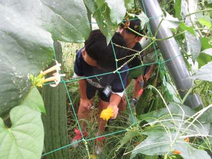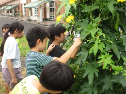 理科の授業で、4年生が育てているヘチマを観察させてもらい、雄花と雌花の違いを実際に観察しながら学習しました。雌花が圧倒的に少なく、なかなか見付けることができませんでしたが、花弁の中央にあるおしべとめしべの違いや花の根元の違いに気付くことができました。