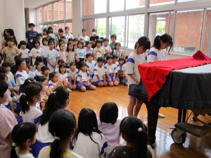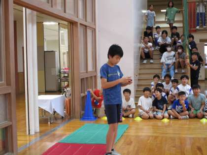 運動集会委員会 第1回とくい芸ショー 公開日 2024/09/19 更新日 2024/09/19 委員会活動 今年度、初めての第1回とくい芸ショーを行いました。ピアノや、ルービックキューブ、マット運動などを披露していました。観に来ていた、たくさんの子供たちが拍手で盛り上げたり応援したりしていました。