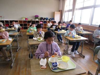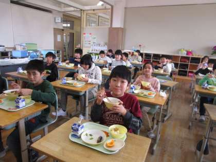 給食が始まりました。5年生になり、ご飯やおかずの量も増えました。もりもり食べていた子供たちでした。