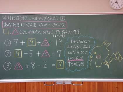 1・2年生 レベルアップもんだい3 こたえ 公開日 2020/04/15 更新日 2020/04/15 学校 わかったかな?じぶんでもんだいをつくって といてみるのもいいね。 あしたのもんだいも おたのしみに!