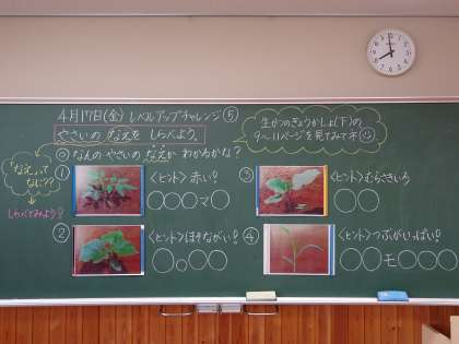 1年生 4/17(金)レベルアップもんだい5 公開日 2020/04/17 更新日 2020/04/17 学校 きょうは、生かつの レベルアップもんだいに ちょうせんだ! 生かつ(下)のきょうかしょの 9〜11ページを ひらいてみよう! <2年生> 生かつ 【大きくなあれ わたしの やさい】 「やさいの なえを しらべよう」