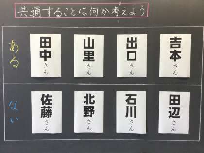 6年生 4/28 レベルアップ問題 公開日 2020/04/28 更新日 2020/04/28 6年生 先生が名前に関するクイズを出しました。 「ある」のグループに共通することは何か考えてみましょう。 また、共通点が分かった人は、自分の名前がどちらのグループに入るか 考えてみましょう。 〈ヒント〉算数の学習を思い出してみよう!