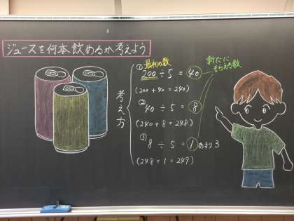 さらに、交換してもらった8本を飲み切り、お店へ空き缶を持って行くと、新たに「1本」(8➗5=1あまり3)もらえます。※あまりの3本では、交換してもらえませんね。