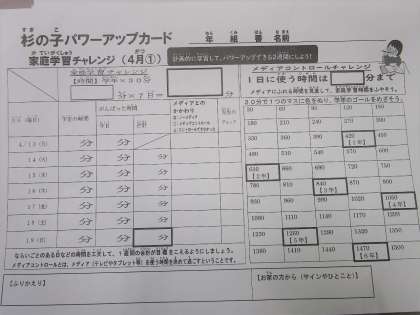 また、先日郵送した「1年生学習計画一覧表」に記載されている、返信用の封筒に入れる「PUカード」とは、「杉の子パワーアップカード」のことになります。(下の写真)よろしくお願いいたします。