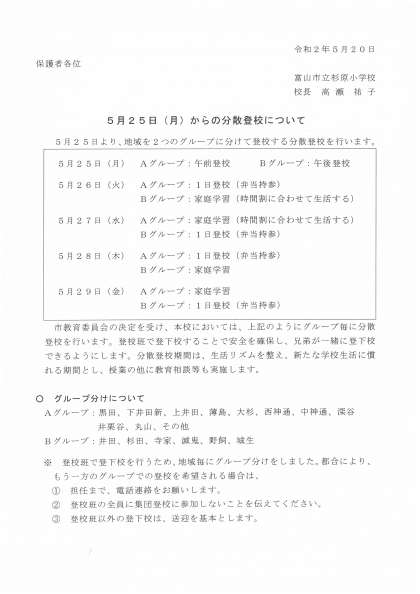 市教育委員会の決定を受け、本校において次のように分散登校を実施いたします。グループとお子さんの登校日時をご確認ください。(配布文書にも掲載してあります)