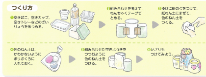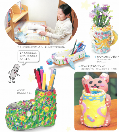 ペットボトル等の空き容器に絵の具で着色した紙粘土をつけ、飾り付ける活動になります。