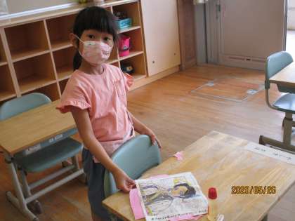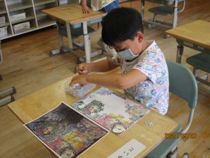 お弁当が終わって、昼休み。でも、3密に気を付けて過ごす昼休み。どんなことができるかな?1年生は、ぬり絵やジグソーパズル、折り紙が人気でした。バックミュージックも流れ、落ち着いた雰囲気が心地よさそうでした。