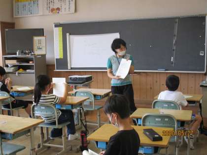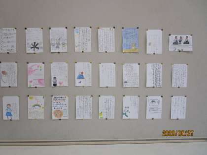 3年生の掲示板に、往復はがきのお返事が飾られていました。臨時休校中は、はがきで先生と心をつなぎ合わせたね。