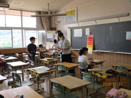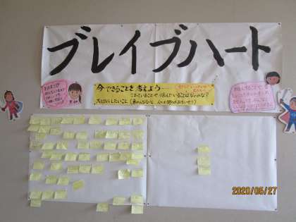学年掲示板には、分散登校で会えない友達に向けて、付箋にメッセージが書いてありました。「早くみんなで会いたいね。」「○○さんへ 早く一緒に遊びたいね。○○より」などなど・・・