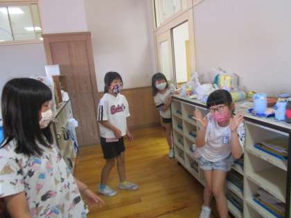 4年生は図工の作品が仕上がってきたようです。 廊下で楽しそうに鑑賞中。「私たち、ちゃんと離れて鑑賞してますよ!」