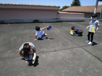 学校のまわりには、どの方向に、どんなものがあるか調べました。屋上に出て、方位磁針を使って方角を確かめながら、見付けたものを書き込みました。子どもたちは、「見付けた!」と大きな声を上げながら、楽しく調べていました。