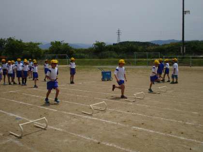 体育の学習でミニハードルを行いました。休業中、十分に運動できなかった子どもも、リズムよく楽しく体を動かしました。